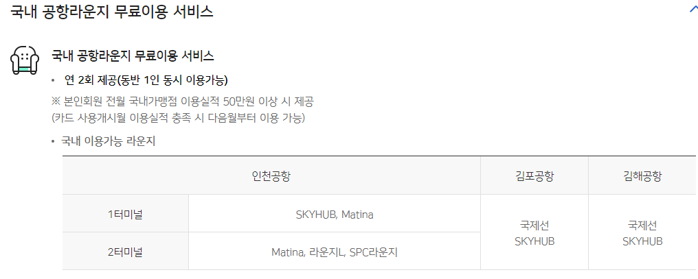 이용 가능한 국내 라운지와 실적은 다음과 같습니다.